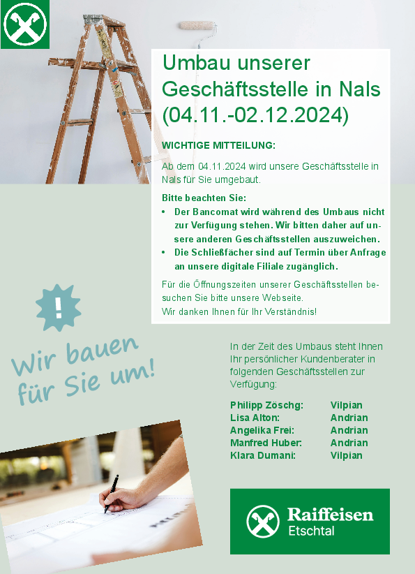 Wir möchten Sie darüber informieren, dass unsere Geschäftsstelle in Nals ab dem 04. November 2024 umgebaut wird. Ziel des Umbaus ist es, Ihnen künftig einen noch besseren Service und modernere Beratungsräume bieten zu können.
