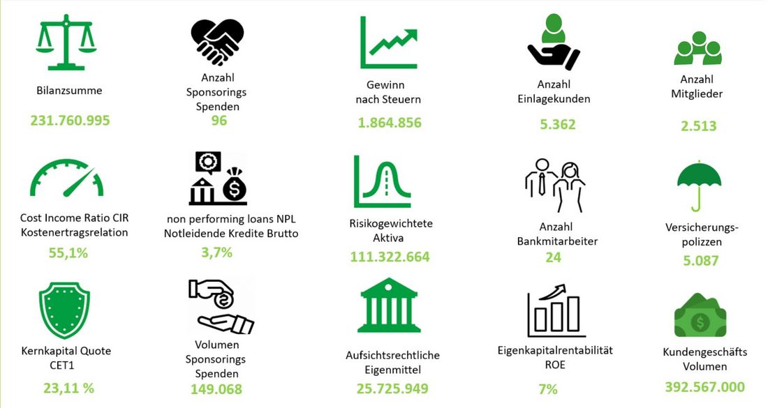 Die Folgende Seite soll unseren Mitgliedern und Kunden einen Einblick in die wesentlichen Kennzahlen der Bank geben. Die Zahlen ermöglichen es auch eine Einordnung unseres Instituts zu tätigen und einen Eindruck über die Stabilität unserer Genossenschaft zu gewinnen.