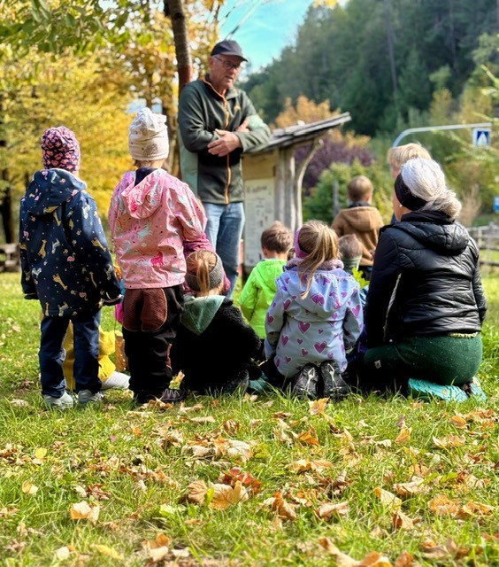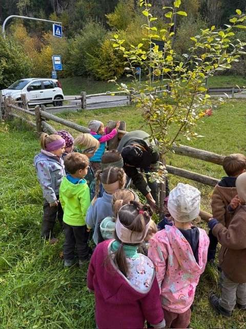 Als Weiterführung des Projekts Blumenwiese haben die Kinder des Waldkindergartens „Waldbienen“ von Prad gemeinsam mit ihren Betreuerinnen Zita Fliri und Alexandra Karner sowie Rudi Maurer vom Nachhaltigkeitsteam der Raiffeisenkasse Prad-Taufers im Spätsommer eine Besichtigung des Insektenhotels in der „Schmelz“ in Prad durchgeführt. Gemeinsam ist man auf Entdeckungsreise am Insektenhotel gegangen und hat herausgefunden, welche Kleintiere sich dort aufhalten. Mit großem Eifer halfen alle Kinder beim Pflanzen von drei Saalweiden mit, welche nun als Futterpflanzen für die verschiedenen Insekten, wie Bienen, Hummeln, Schmetterlinge, Käfer und vieles mehr, dienen. Mit kleinen Bachsteinen aus dem nahe gelegenen Suldenbach haben die Kinder einen Schutzring um die Saalweiden errichtet. Die Pflanzen wurden freundlicherweise vom Pflanzgarten der Agentur für Bevölkerungsschutz in Prad am Stilfserjoch zur Verfügung gestellt. Auch dort freute man sich über das Naturschutz-Engagement des Prader Waldkindergartens „Waldbienen“.