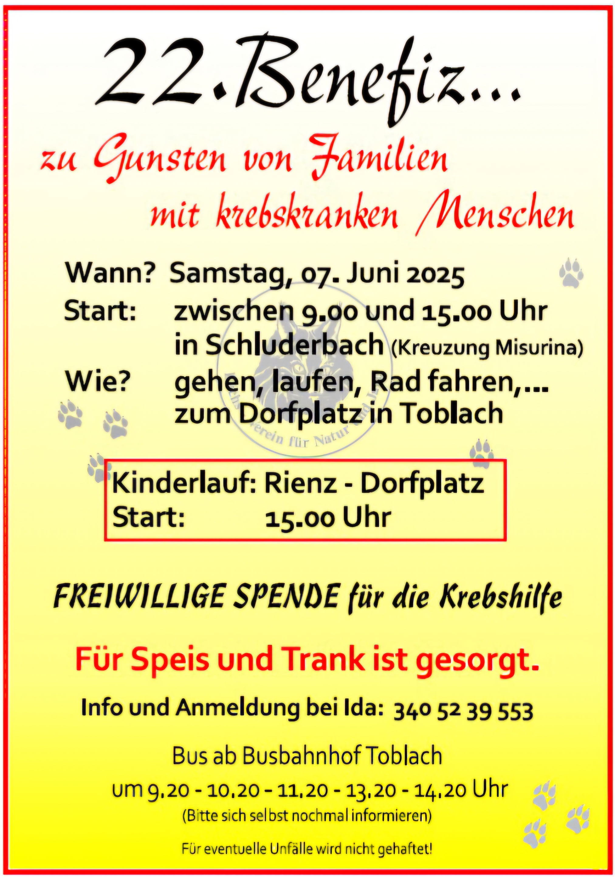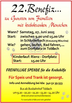 Am 7. Juni 2025 findet die Benefizveranstaltung der Südtiroler Krebshilfe – Bezirk Oberpustertal statt. Die Raiffeisenkasse Toblach unterstützt diese Veranstaltung wiederum mit dem Ankauf und dem Druck der T-Shirts für die teilnehmenden Kinder.