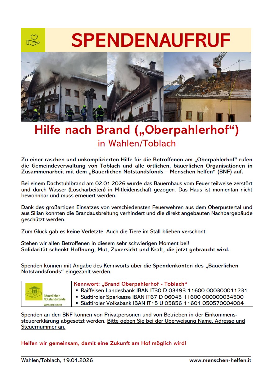 Die Gemeindeverwaltung von Toblach und alle örtlichen bäuerlichen Organisationen in Zusammenarbeit mit dem „Bäuerlichen Notstandsfonds – Menschen helfen“ rufen zu einer raschen und unkomplizierten Hilfe auf.