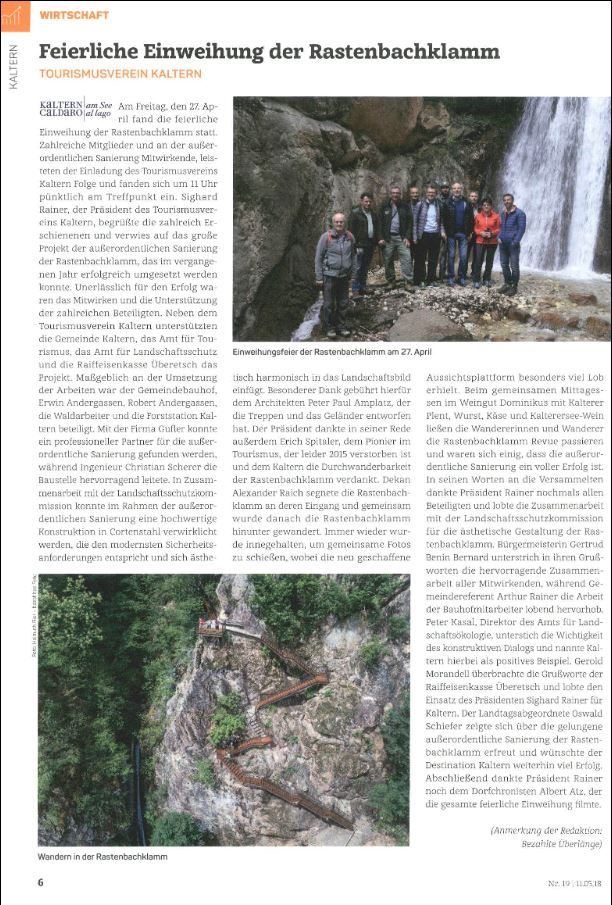- Überetscher Gemeindeblatt - 11.05.2018 - "Feierliche Einweihung der Rastenbachklamm"
