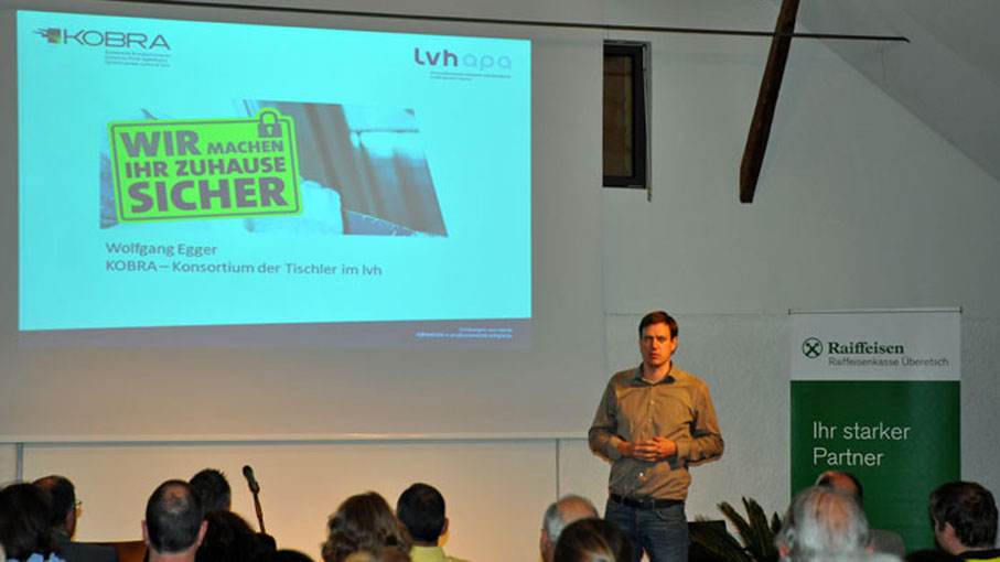 Wolfgang Egger, Handwerksmeister und Vertreter der Berufsgruppe der Tischler, beeindruckte die Anwesenden wie leicht sich herkömmliche Türen und Fenster öffnen lassen. Dabei machte er darauf aufmerksam, dass bereits ein geringfügiges Plus an Sicherheit Einbrecher abschreckt, da in der Regel Einbruchsversuche, sofern sie nicht innerhalb von 3 Minuten erfolgreich sind, abgebrochen werden.
