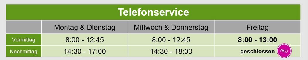 Um Ihnen einen noch besseren Service bieten zu können, erweitern wir ab Montag 1. Juli 2024 unsere Beratungszeiten. Ab diesem Datum können Sie Beratungen auf Termin von Montag bis Donnerstag von 7:30 Uhr bis 18:30 Uhr und Freitag von 7:30 Uhr bis 13:00 Uhr wahrnehmen. Dies gibt Ihnen die Flexibilität, unsere Beratung zu Zeiten in Anspruch zu nehmen, die Ihrem Zeitplan am Besten entsprechen.