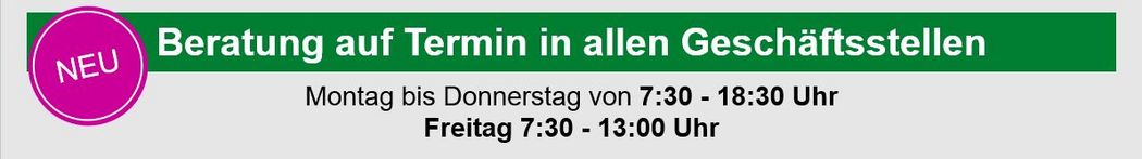 Zudem bleiben unsere beliebten Abendöffnungszeiten am Mittwoch und Donnerstag bestehen. An diesen Tagen sind wir nach wie vor auch abends für Sie da, um Ihre Bankgeschäfte zu erledigen oder Beratungen auf Termin durchzuführen.
