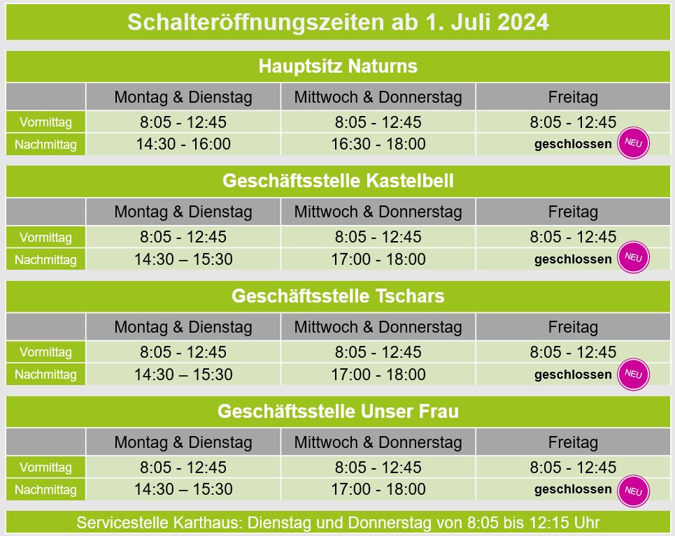 Anpassung der Beratungs- und Schalterzeiten ab 1. Juli 24