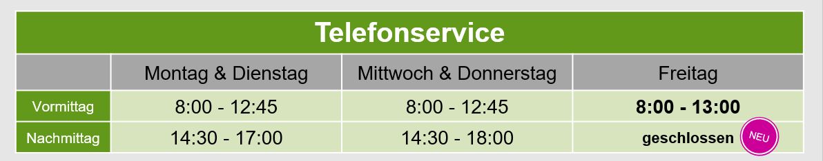 Bitte beachten Sie dass unsere Schalterdienste ab dem 1. Juli 2024 Freitags nur noch vormittags von 8:00 Uhr bis 12:45 Uhr geöffnet sind. Freitagnachmittags sind ab diesem Datum alle Geschäftsstellen geschlossen.