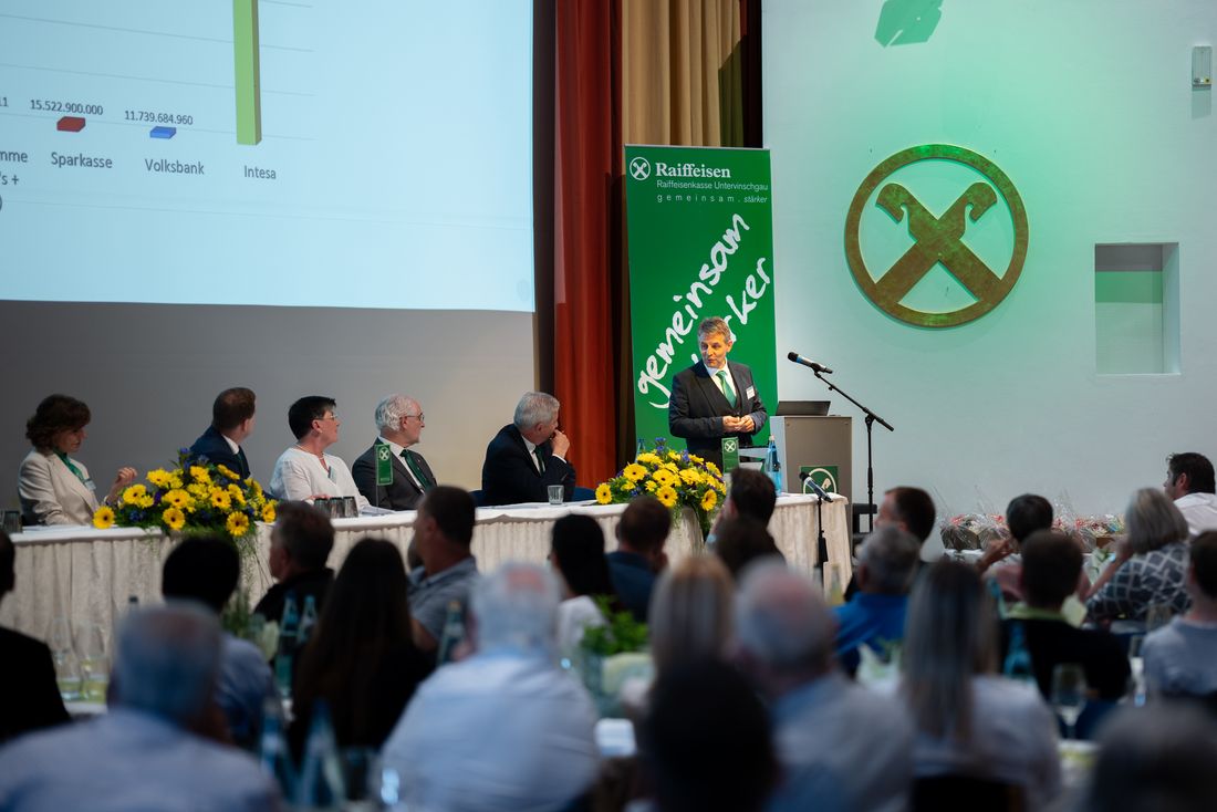 Der Obmann Wolfram Gapp begann mit den Informationen aus dem Geschäftsbericht 2024. Dabei informierte er die anwesenden Mitglieder, dass das Kundengeschäftsvolumen bis Jahresende 2024 auf 722 Mio. € angewachsen ist. Im Jahr 2024 wurde ein Gewinn von knapp 5,7 Mio. € erzielt und damit verfügt die Raiffeisenkasse Untervinschgau nun über eine stabile Eigenkapitalausstattung von 92 Mio. €.