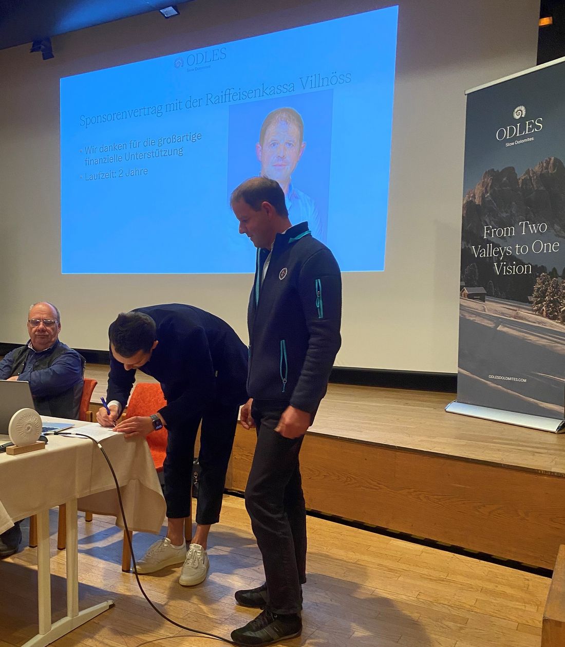 Der Vertrag wurde im Rahmen der Vollversammlung der Tourismusgenossenschaft Odles im Beisein des Präsidenten Michael Messner sowie des Obmanns der Raiffeisenkasse Villnöß, Paul Obwexer, unterschrieben.