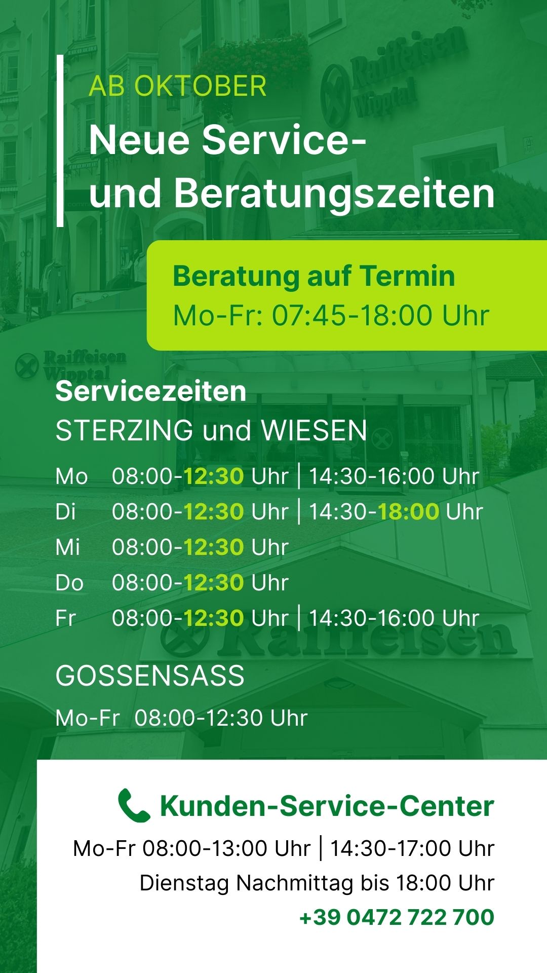 - Servicezeiten: von 08:00-12:30 Uhr, verlängerter Dienstag-Nachmittag von 14:30-18:00 Uhr in Sterzing und Wiesen