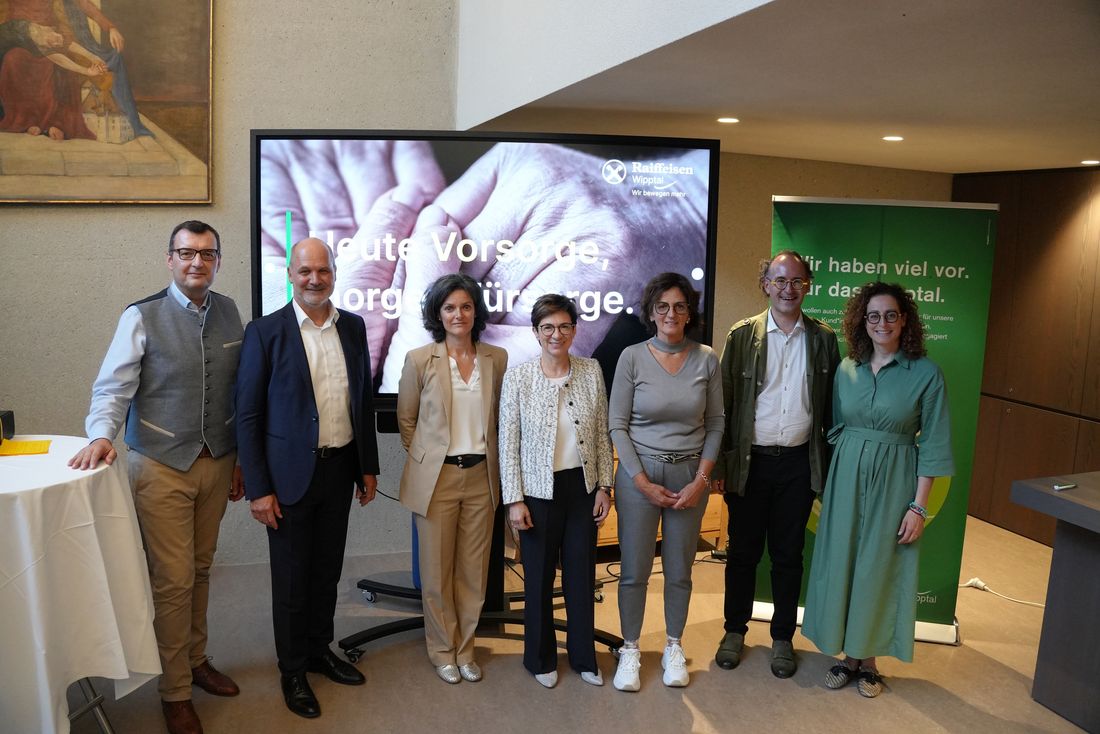 v.l.: Moderator Theo Hendrich, Markus Pretto (RVD), Larissa Thaler (Raiffeisenkasse Wipptal), Christina Pupp (Raiffeisenkasse Wipptal), Elisabeth Hopfgartner (Seniorenwohnheim Schloss Moos), Ulrich Seitz (Südtiroler Alzheimervereinigung), Ursula Thaler (Sozialgenossenschaft humanitas24)