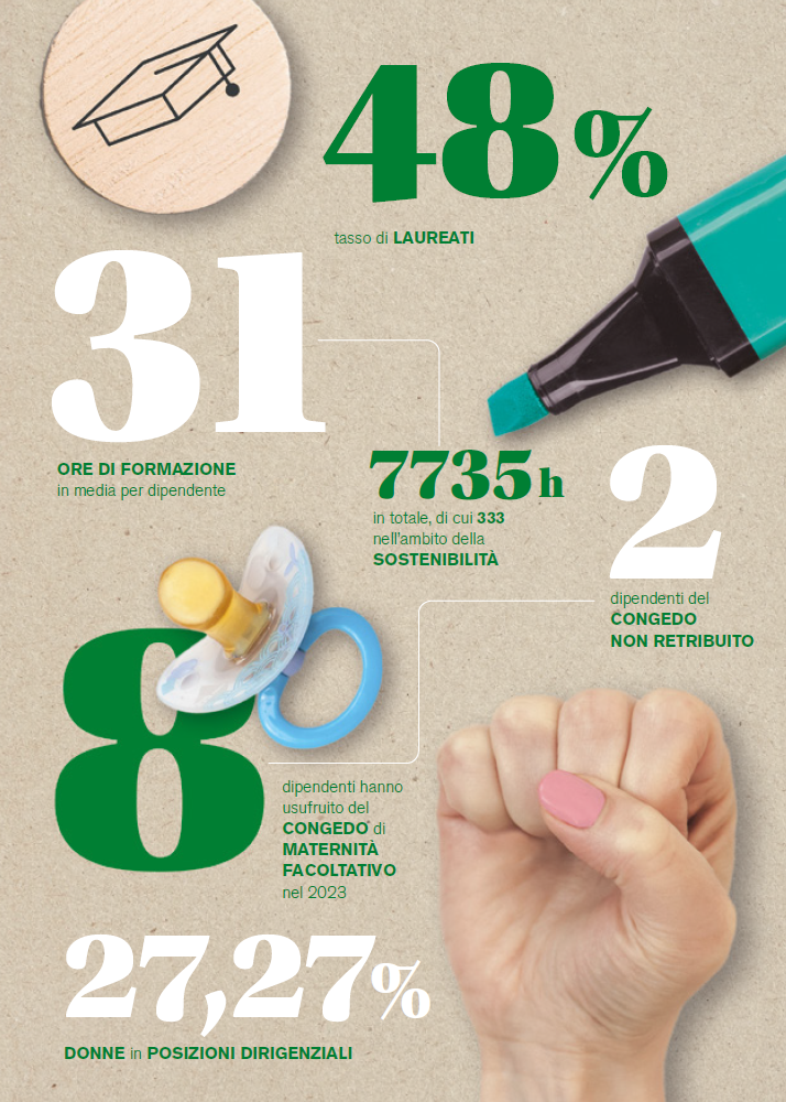 I nostri dipendenti costituiscono una componente di centrale importanza per la nostra strategia di sostenibilitá. Abbiamo cura dei nostri dipendenti e ci impegniamo per creare un ambiente di lavoro sano e positivo e altrettanto innovativo, attento alle esigenze delle famiglie e orientato alla crescita. Poiché il successo di ogni impresa dipende in larga misura dai propri dipendenti.