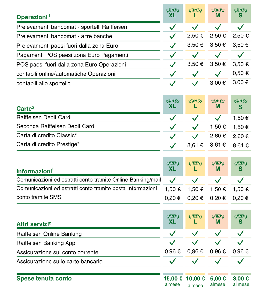Le esigenze inerenti ad un conto privati sono molto individuali e diverse: fate più o meno operazioni, utilizzate Online Banking oppure fate movimenti allo sportello, preferite il pagamento dei singoli servizi o a forfait? Con i nostri nuovi conti a pacchetto è semplice trovare la soluzione giusta per voi. Potete scegliere tra quattro conti con diversi servizi inclusi. Ogni pacchetto - S, M, L o XL - comprende un conto affidabile con servizi su misura e costi definiti in modo semplice e la massima sicurezza. Come di consueto, vi offriamo tutti i servizi che una banca moderna prevede. Alcuni di questi sono inclusi nel pacchetto del vostro conto, mentre altri portano addirittura ad uno sconto sul canone annuale.
